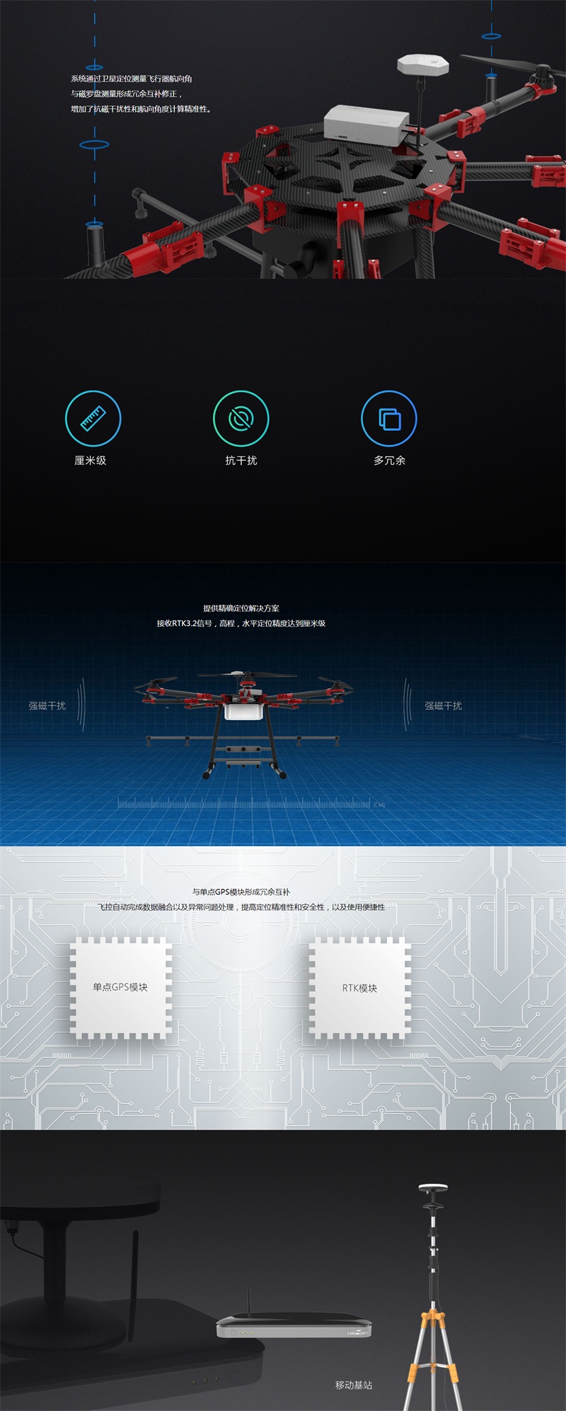 无距科技推出了低成本高精度定位与测向模块。 该模块由小体积、低功耗的 单板卡GPS/GRONASS/北斗三星8频点卫星定位组件,双路3频点航空天线、 差分链路、地面基站组成。 该系统通过通过卫星定位测量飞行器航向角与磁 罗盘测量形成冗余互补修正, 增加了抗磁干扰性和航向角度计算精准性;同 时,该系统可接受RTK3.2信号,使得高程,水平定位达到厘米级,并与标配 单点GPS模块形成冗余互补, 数据融合以及异常问题处理由飞控计算机自动 完成,进一步提高定位精准性和安全性,以及使用便捷性。