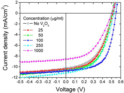 具有V2O5中间层的光伏器件在100mW / cm2 AM 1.5G照射下的各种浓度的JV曲线。
