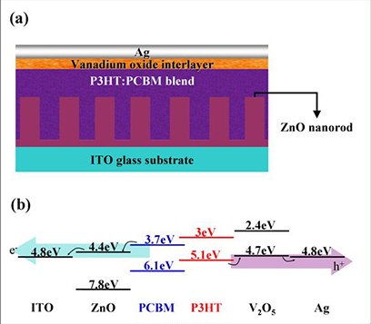 这项工作的目的是通过引入溶液加工的氧化钒(V2O5)作为阳极夹层,实现与ZnO纳米棒阵列杂交的低成本和高效率的倒转PSC。我们的调查显示,由于有效地抑制了有机/金属界面处的泄漏电流,所以通过引入V2O5层来改善光伏器件性能。与传统的BHJ结构(氧化铟锡(ITO)/ PEDOT:PSS /有源层/ Al)相比,使用倒置结构克服了一些障碍,例如Al的易氧化和PEDOT:PSS的电不均匀性作为其对ITO的腐蚀。倒置的PSC利用空气稳定的高功函数电极作为背接触来收集ITO上的空穴和金属氧化物纳米结构以收集电子。此外,据报道,ZnO纳米棒具有在与ZnO纳米棒杂化的倒置PSC中收集和传输电子的有益效果。我们的工作结合了V2O5中间层和ZnO纳米棒的这些优点,从而抑制了漏电流,改善了电荷载体的收集和运输,从而提高了PCE,开路电压(VOC)和填充因子(FF)设备。另外,V2O5中间层可以作为光学间隔物来增加光吸收,导致短路密度(JSC)的增加。此外,V2O5中间层和ZnO纳米棒阵列均采用简单的溶液工艺制造,非常适合用于高通量卷对卷制造。虽然PEDOT:PSS层可以进行溶液处理,其吸湿特性可能由于水吸附而形成绝缘块,从而降低了设备的性能。相反,V2O5对水相对不敏感,在空气中稳定。溶液处理的V 2 O 5中间层可以用作防止氧气或水分进入和降解光敏层的屏障。另外,这种方法不需要像PEDOT:PSS和真空设备那样的退火处理,所以简单,快捷,有效。这对于低成本和大面积印刷太阳能电池的商业化实现非常重要。溶液处理的V 2 O 5中间层可以用作防止氧气或水分进入和降解光敏层的屏障。另外,这种方法不需要像PEDOT:PSS和真空设备那样的退火处理,所以简单,快捷,有效。这对于低成本和大面积印刷太阳能电池的商业化实现非常重要。溶液处理的V 2 O 5中间层可以用作防止氧气或水分进入和降解光敏层的屏障。另外,这种方法不需要像PEDOT:PSS和真空设备那样的退火处理,所以简单,快捷,有效。这对于低成本和大面积印刷太阳能电池的商业化实现非常重要。