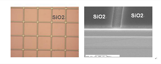 衬底,生长薄的牺牲AlAs释放层。在外延膜生长之后,通过PECVD生长厚二氧化硅(SiO 2)层。之后将光刻胶旋涂在SiO2层上,并进行UV光刻,如图2(a)所示。每个小立方的周期性图案的大小是25μm×25μm。在光刻之后,通过如图2(b)所示的反应离子刻蚀(RIE)将图案转移到涂覆在双结器件上的SiO2层中,然后除去光刻胶。蚀刻时间被优化以确保可靠的图案转移,同时对双结器件的表面造成最小的损伤。在RIE刻蚀之后,如图3所示,周期性的方形(25μm×25μm)图案被精确地转移到SiO2掩模模板上,