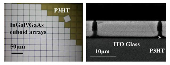 以下是我们开发的传输技术。InGaP / GaAs双结正方形(25μm×25μm)微米长方体阵列通过外延剥离工艺从GaAs衬底中释放出来。将这些InGaP / GaAs微立方阵列移植到ITO玻璃衬底上成功旋涂的P3HT薄膜上。除了显着的成本降低,我们的方法显示了快速移植和高效大面积器件制造的潜力。