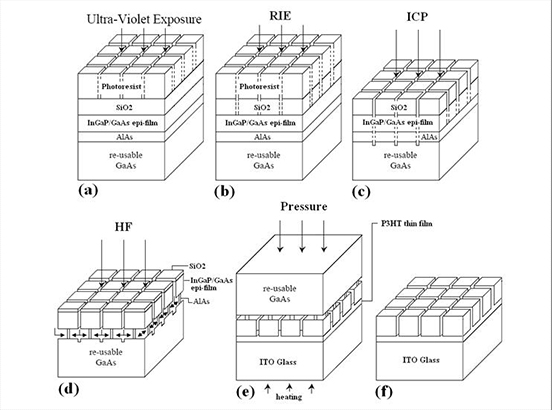 我们已经成功地使用外延剥离(ELO)技术将InGaP / GaAs双结方形(25μm×25μm)的微立方光伏阵列转移到在ITO玻璃衬底上旋转的P3HT膜上。与传统的ELO方法(包括稳定曲率半径的WI-ELO和ELO)相比,我们的新方法大大缩短了提升时间。此外,对于上述方法,当被剥离的外延膜的面积变大或者器件的应用变得更加弯曲时,可能发生微观裂开裂纹。这将限制其应用和性能。然而,我们的新方法显示了快速移植和同时进行大面积器件制造的潜力,而没有引起人们的关注。