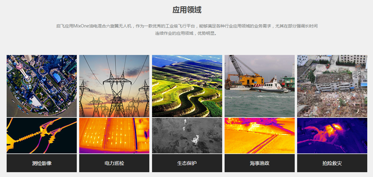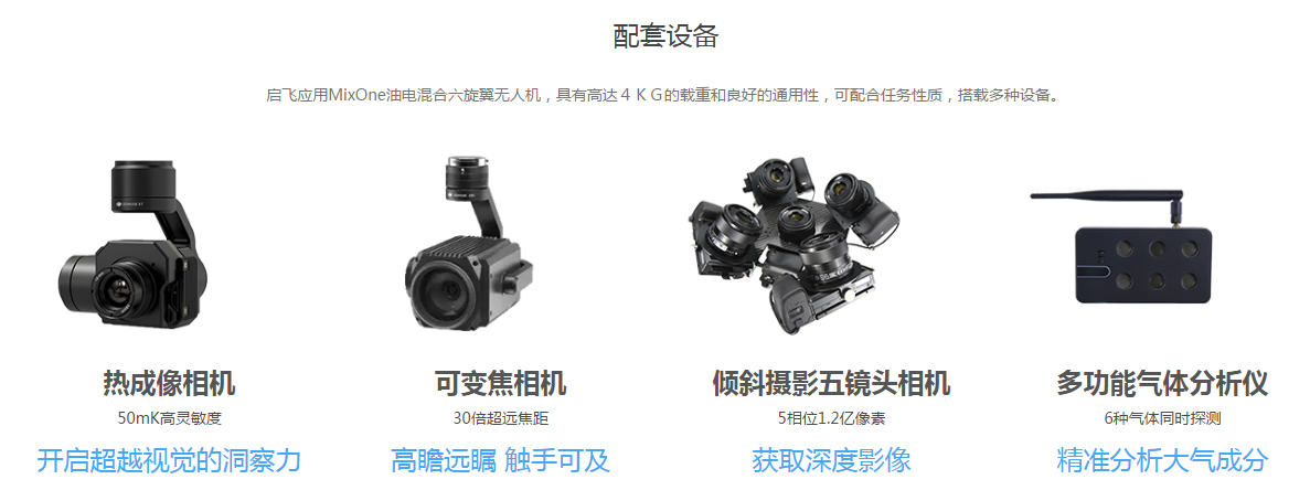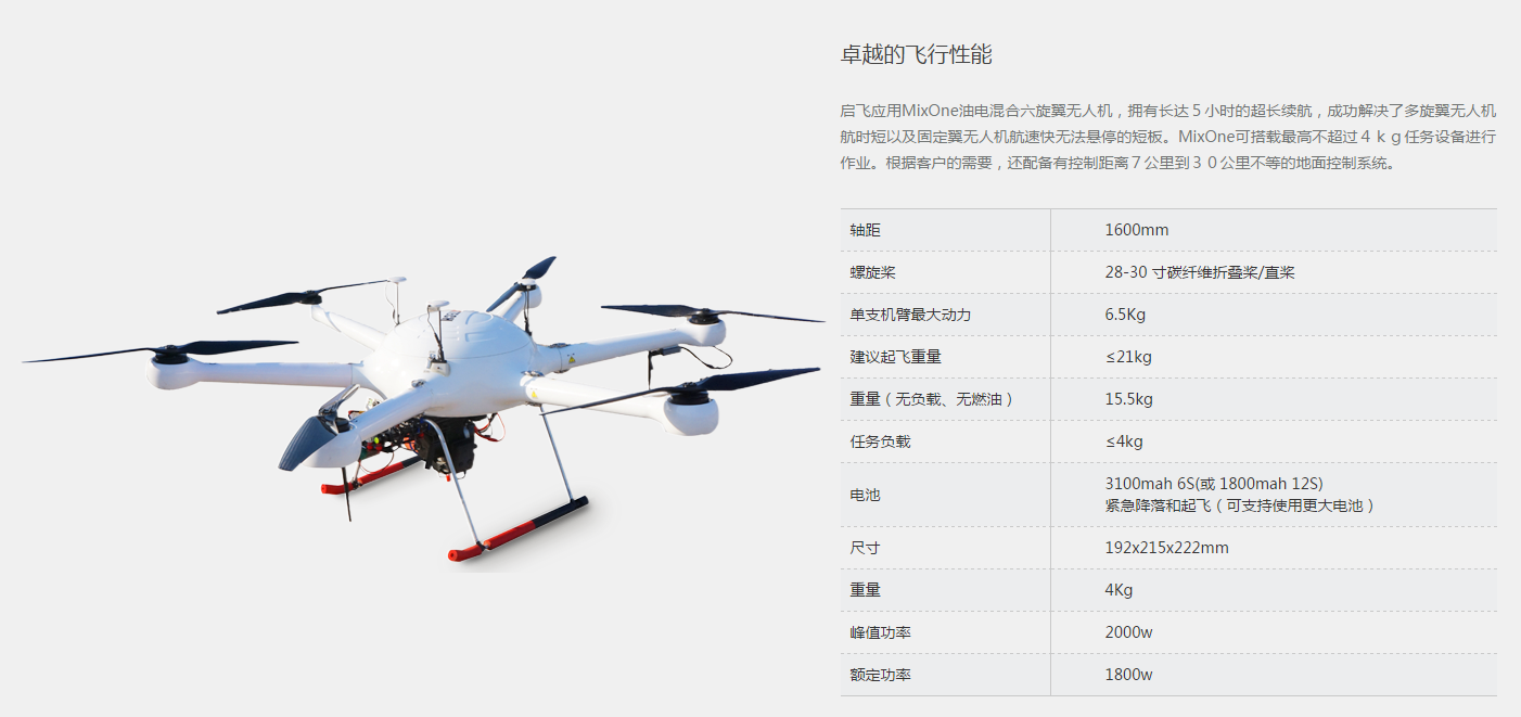 MixOne油电混合动力无人机,是一款高端工业级多旋翼无人机,设备可靠性高,具备抗风、防雨、防电磁等诸多优势。启飞应用MixOne油电混合人机提供最高长达5小时的续航时长,打破纯电动无人机的续航壁垒。作为专业的工业级飞行平台,MixOne可搭载各种任务载荷甚至是进一步的改装,从而满足用户多样化任务需求。