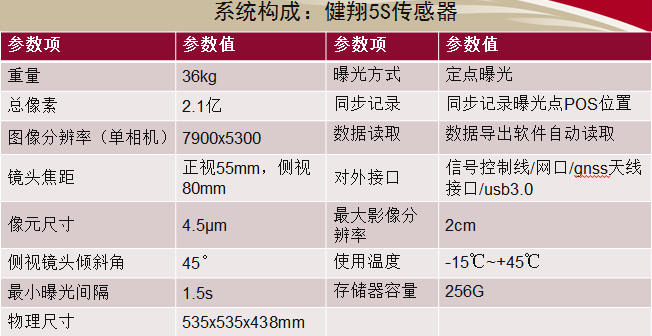 倾斜摄影传感器(5S):单相机4200万像素全画幅相机,总2.1亿像素相机,最小曝光间隔1.5s每小时完成8cm分辨率倾斜摄影数据4-8km²。