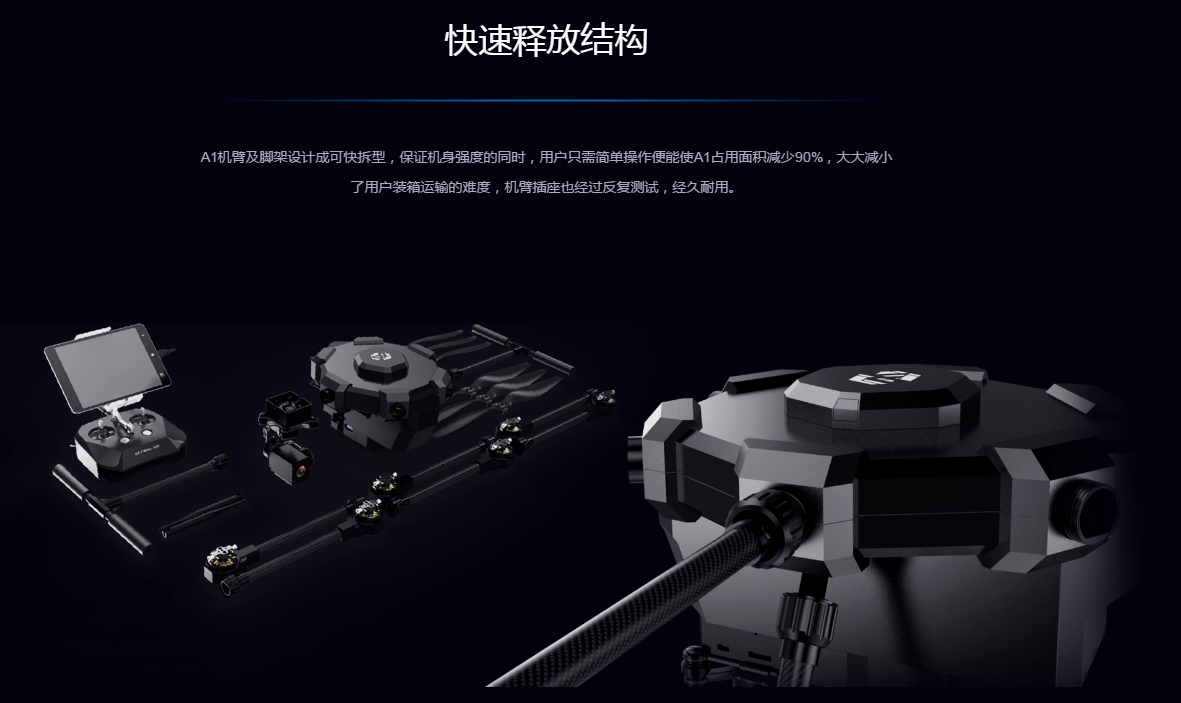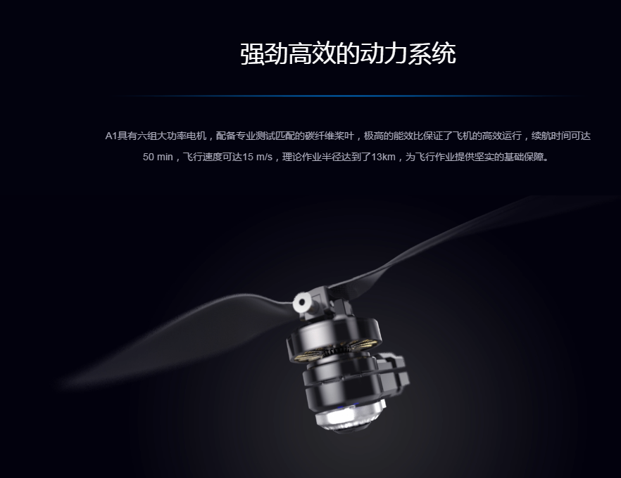 天行创科A1六旋翼智能无人机,采用最新定制级的飞行控制系统,强劲高效的动力系统,快速拆装便携的机身,配备专业级的手持地面站。该设备具有50 min超长续航时间,最大13km作业半径,最快15 m/s时速,为用户快速解决中短程无人飞行任务,同时A1还具有极强的扩展性,根据用户需求,可搭载更多扩展模块。