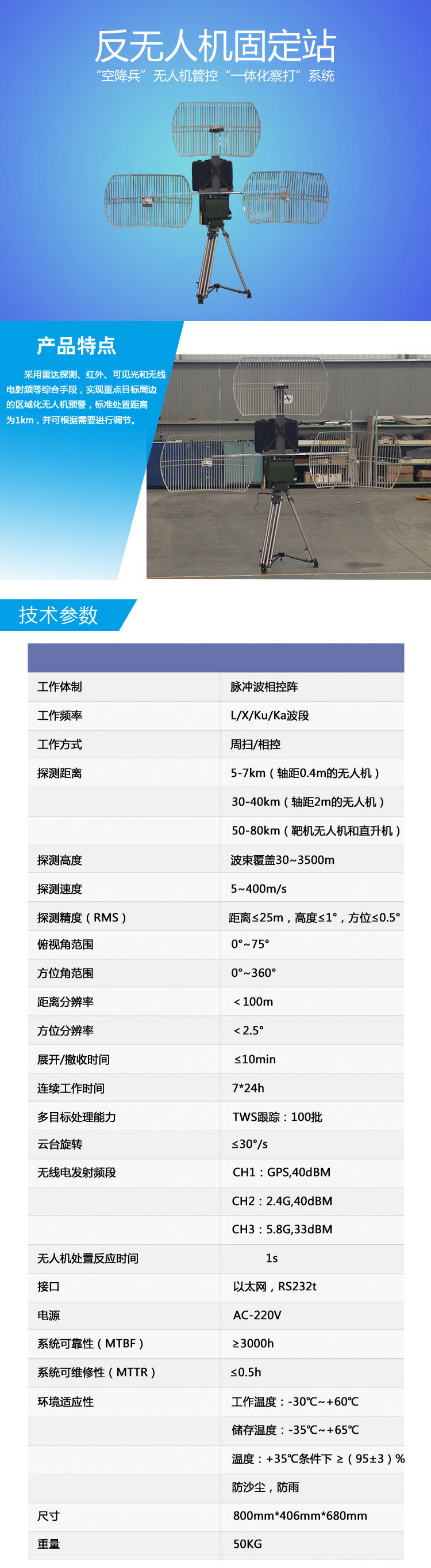 反无人机“察控一体”固定站采用雷达探测、红外、可见光和无线电射频等综合手段,实现重点目标周边的区域化无人机预警,标准处置距离为1km,并可根据需要进行调节。