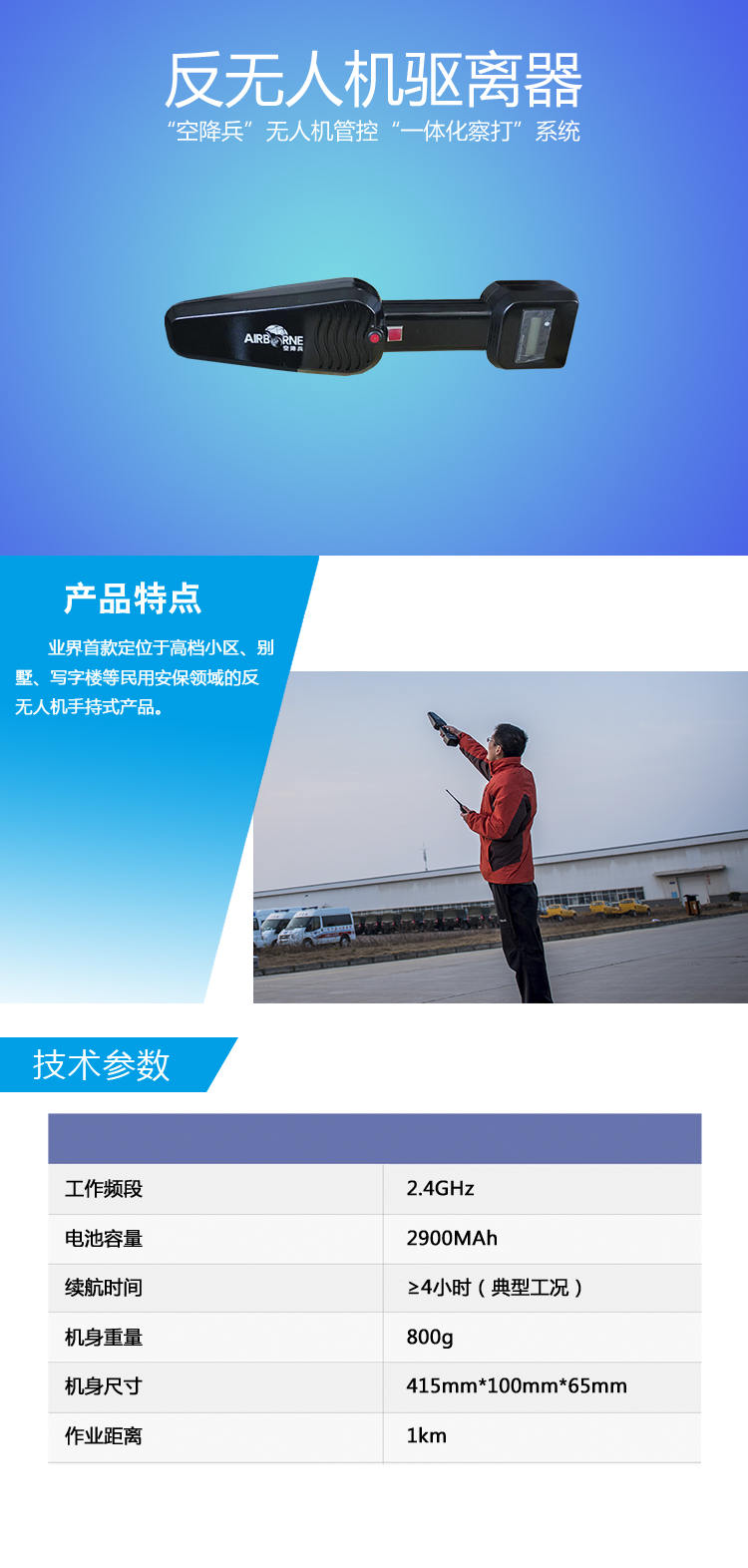 鉴真防务技术便携式无人机反制器是一款可灵活运用于安保人员携带反无人机干扰行动的无人机管控设备。鉴真防务技术便携式无人机反制器是业界首款定位于高档小区、别墅、写字楼等民用安保领域的反无人机手持式产品。