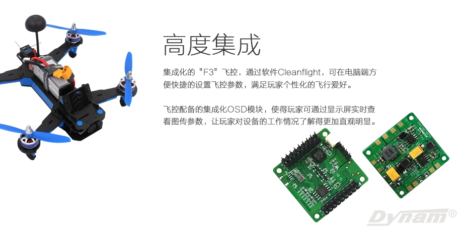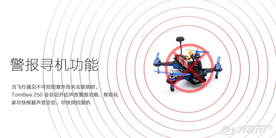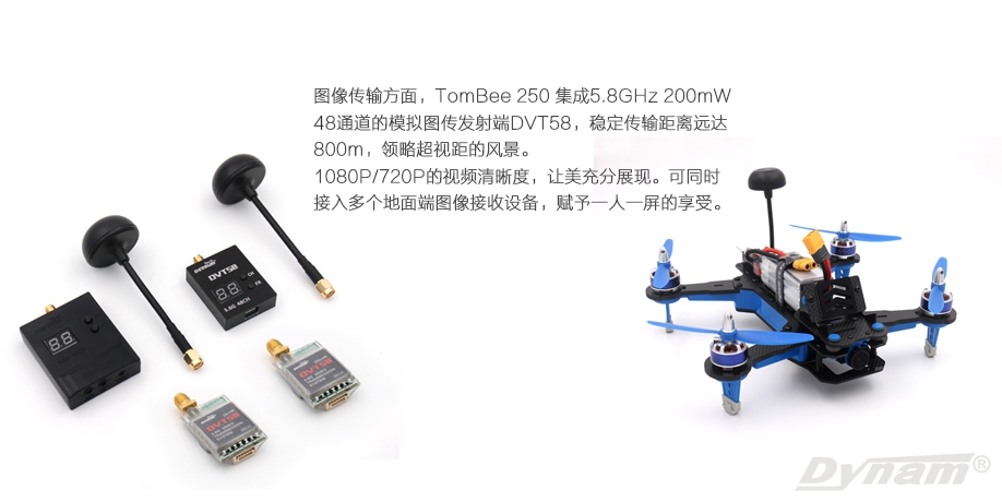 TomBee 250是轴距为250mm的4轴穿越机,主要由一体化动力与控制系统和碳纤维机架构成,是一款体积小、速度快的穿越机。配备了800TVL 3百万像素迷你摄像头、5.8G图传发射机及OSD模块,能够为用户带来完美的FPV视觉体验。