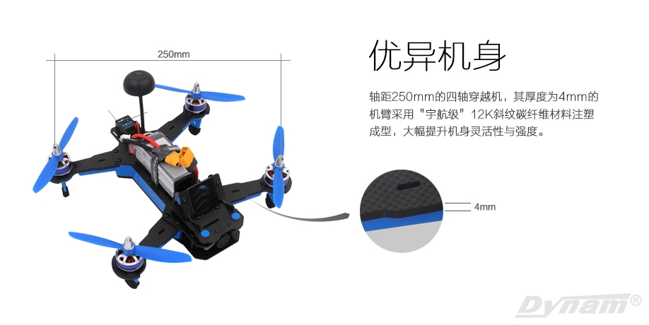 - 4mm碳纤维可拆卸的机臂,提高了机身的灵活性和强度。