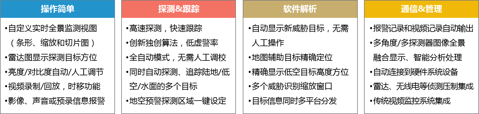 系统可根据应用场景光学特性自适应调整探测器的积分时间、动态范围等成像特性以达到各种光照条件下的最优成像效果,从而实现全天候全景成像及广域目标探测;系统随时提供任何方向的实时入侵探测和安全预警,防范传统威胁和不对称威胁,可同时探测上百个低空无人机等低慢小和地面、水面人车船等目标/p>