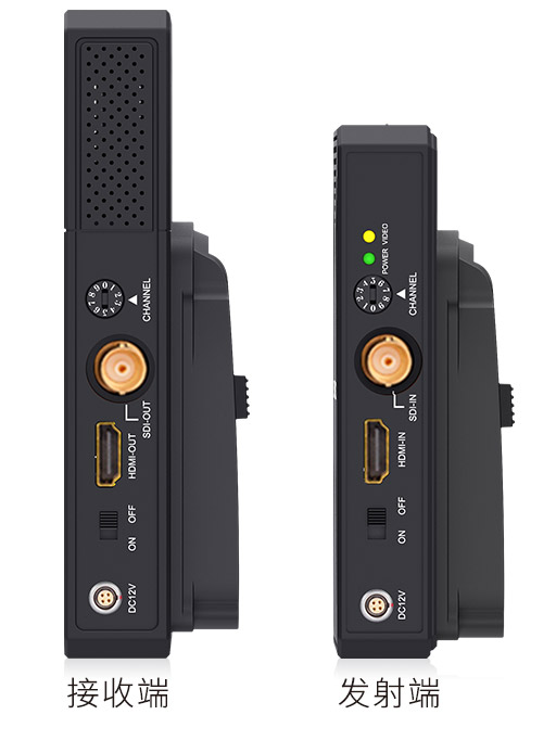 WHD150发射端和接收端均为小巧型设计,发射端和接收端都具有用于安装到摄像机的上1/4"-20孔,而且配备索尼F970电池扣板(标配),可直接安装标准F970电池进行供电,还有D28S/D54、LP-E6和U60(选配)多种电池扣板可供选择。除了电池供电,发射端和接收端皆可通过4-PIN LEMO DC接口供电,电压在7-36V范围内。
