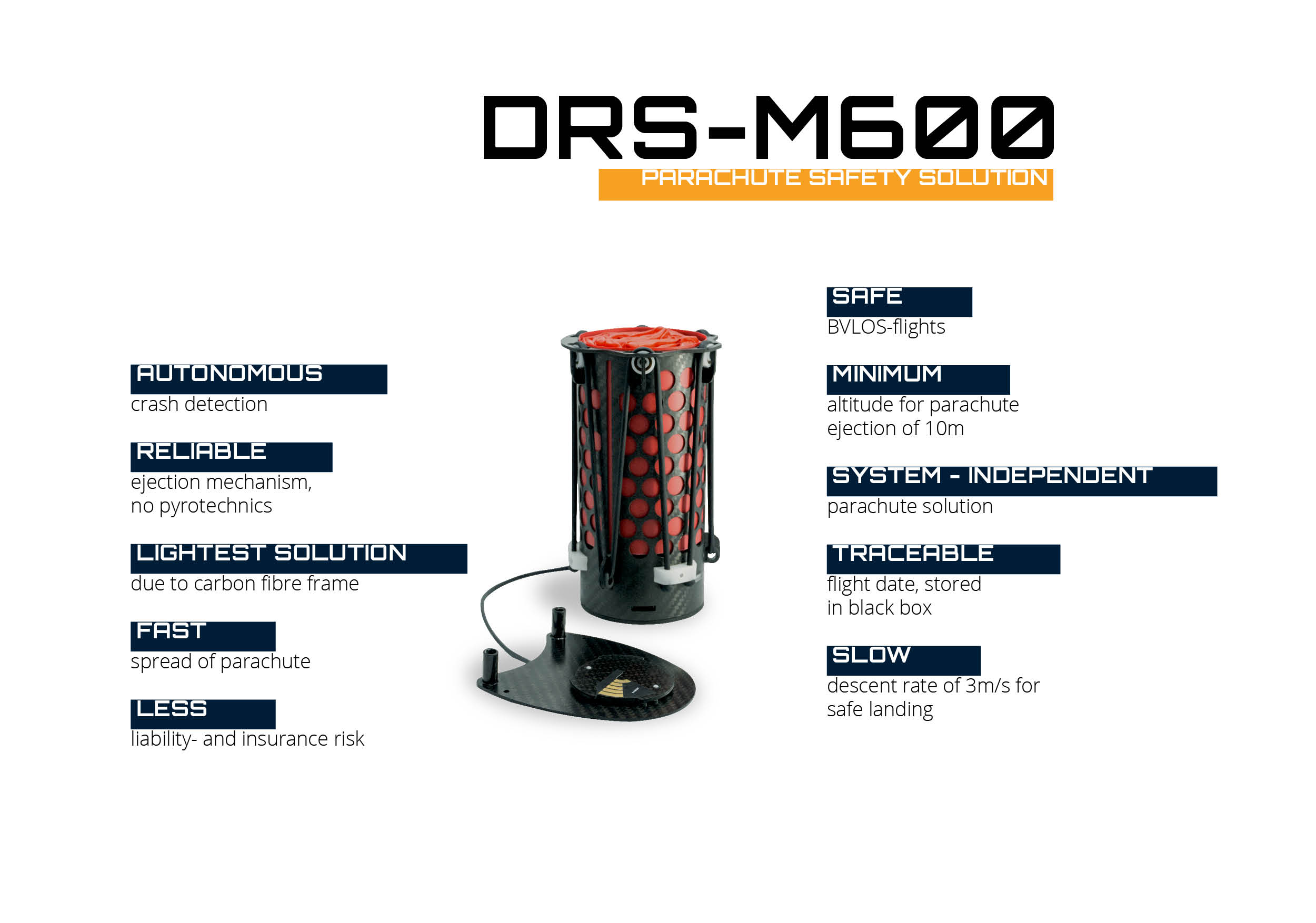 我们新产品的主要目标是降低人员在地面上受到伤害的风险,并在空中无人机故障时安全降低昂贵的设备。无人机的崛起势不可挡,但凭借我们的系统,它们仍然是安全的。