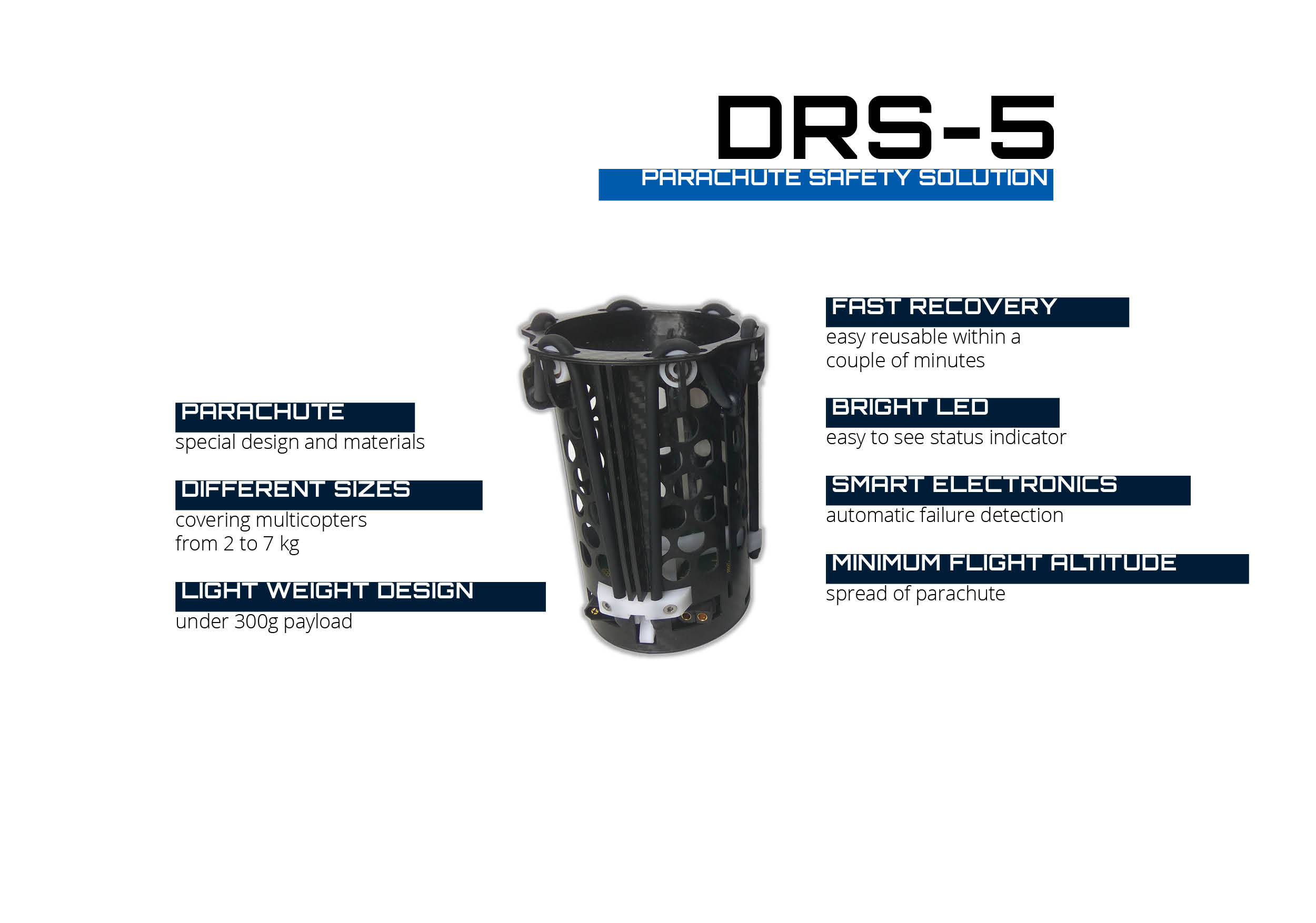 我们新产品的主要目标是降低人员在地面上受到伤害的风险,并在空中无人机故障时安全降低昂贵的设备。无人机的崛起势不可挡,但凭借我们的系统,它们仍然是安全的。