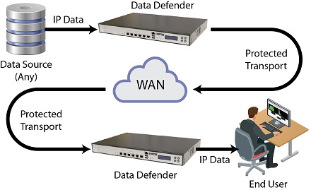 DataDefender支持灵活的部署体系结构,可作为独立设备,虚拟应用程序或集成软件使用。DataDefender作为网络边缘解决方案运行。数据以UDP或TCP流的形式接收。然后,数据以受保护的格式打包以进行WAN传输。DataDefender通过基于UDP构建的协议在WAN上发送受保护的数据,因此不需要特殊的路由器配置,DataDefender也不会利用网络上的任何特殊要求。在远端,接收DataDefender解码受保护的流,修复任何错误,并将数据作为UDP或TCP流传递。
