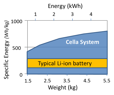每克Cella材料可产生高达1升的氢气,使其具有非常高的比能(每单位重量的能量),使其成为重量至关重要的移动或便携式应用的理想选择。该材料可以包装成一个盒子,与燃料电池相结合,具有锂离子电池比能量的两到三倍,或者制造一个与700大气压缩氢气相当的系统,但没有相同的安全问题或成本基础设施。