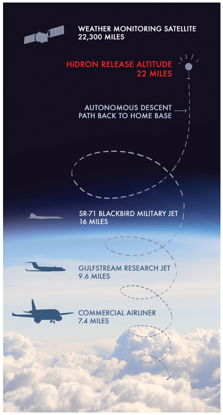 HiDRON™通过充满氦气的气球发射到平流层。一旦启动,自动驾驶仪和集成的大气测量系统就会将数据实时传输到地面站。在达到所需高度(或由地面操作员指示)后,HiDRON从气球释放并滑回预先指定的着陆点。独特的自动驾驶仪飞行算法可以处理现场数据,如热量或波浪条件,以增加飞行持续时间或将飞行路径聚焦到特定区域。
