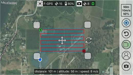 Atlas Flight允许您使用RedEdge和Sequoia多光谱相机快速轻松地为您的Ag100无人机计划任务。只需轻点几下,您就可以收集数据:只需设置所需的高度,速度和重叠即可。Atlas Flight将自动配置最佳飞行路径和摄像机设置。登录您的Atlas帐户,立即在您保存的某个字段上创建航班计划。计划多电池任务?没问题。您可以在应用程序中暂停,停止和恢复任务 - 即使更换电池后也是如此。