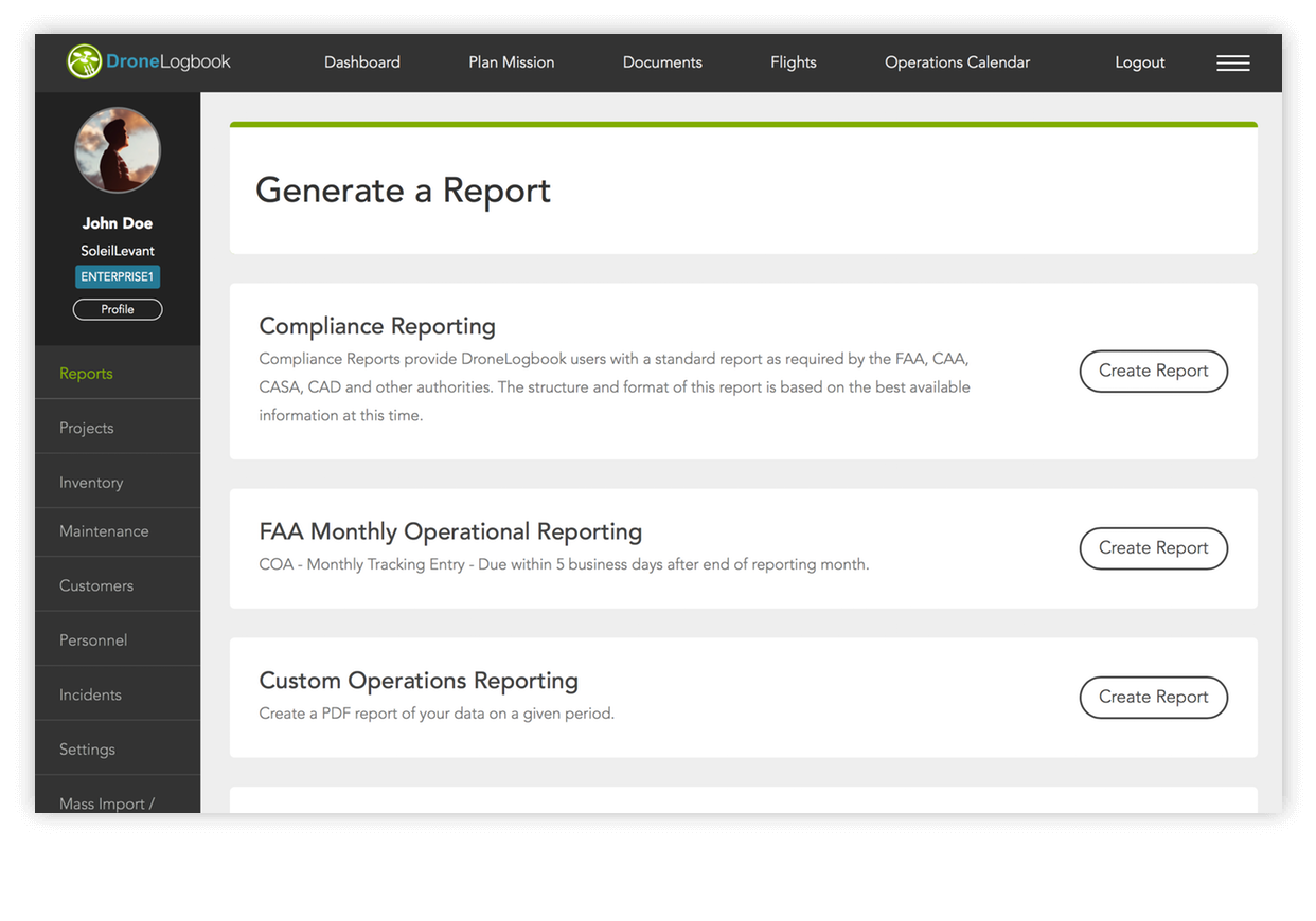 您商业运营中最重要的部分是确保您保持合规。DroneLogbook会跟踪您的所有操作,以便您在几秒钟内创建报告。在几秒钟内生成合规性(FAA,CAA,CASA,CAD,EASA,DGAC,TBST)报告。监管机构要求您按需生成记录。此外,我们还提供一系列自定义报告,以便您跟踪飞行员,航班,维护等。