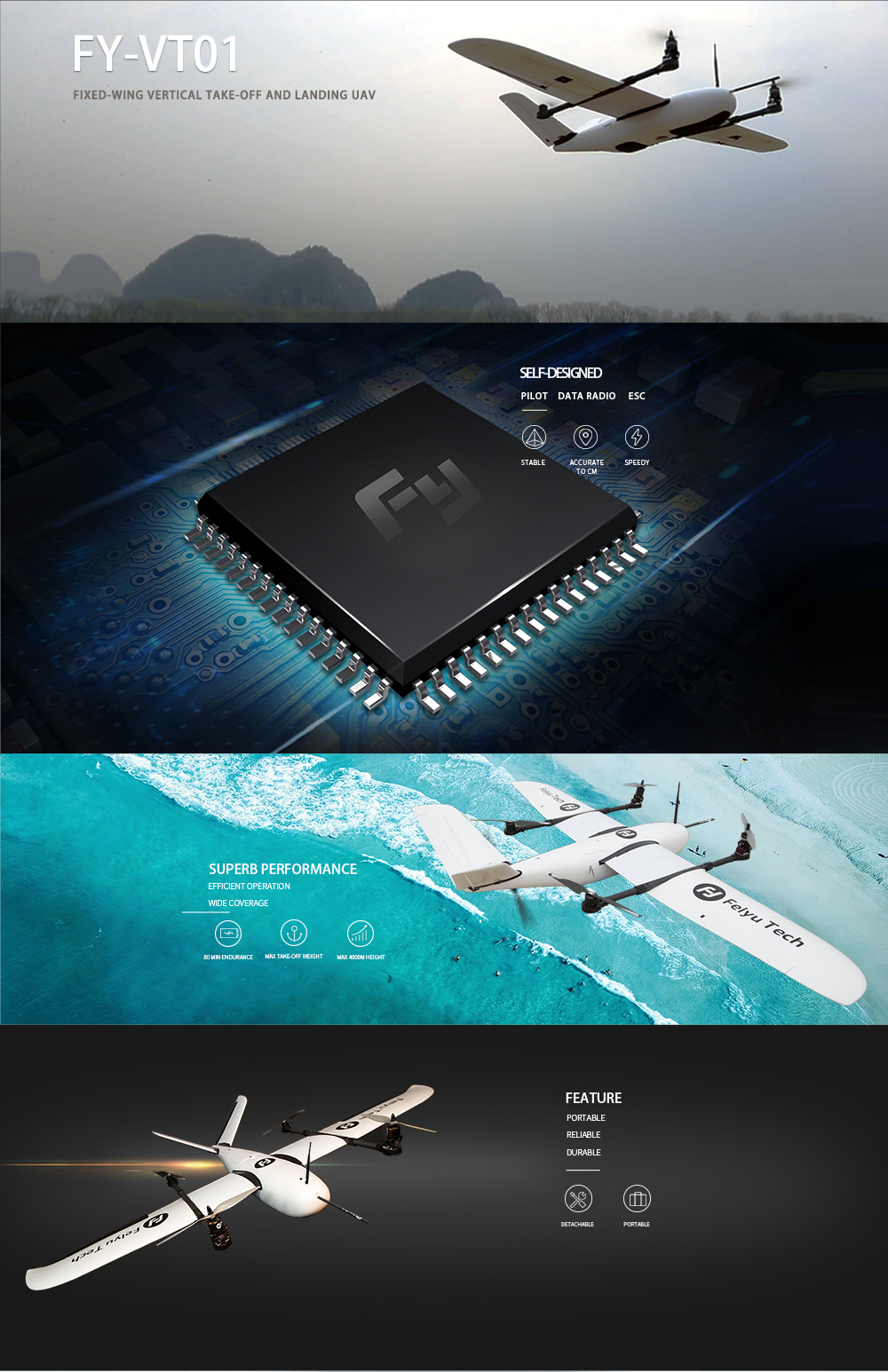 飞宇VT01(FY-VT01)无人机是桂林飞宇无人机研发团队历时两年打造的倾转式垂直起降固定翼无人机,拥有全球技术领先的 长距离自动驾驶无人飞行器系统,可用于执行数据收集、协调指挥、搜索、测量、通讯、检测、侦查以及航空拍摄等多种空中任务。相较市面上传统的旋翼和定翼飞行器,FY-VT01拥有多旋翼的机动性及垂直起降能力,结合固定翼飞行器的长续航优势,提供更长的滞空时间与巡航面积,实现多样化的任务应用。