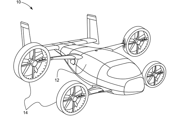 [0008]所述的导管风扇14的每一个包括一个转子,其中每个导管内旋转。飞机的升力由转子产生。在示例性实施例中,飞行器是四旋翼系统。飞行器10被配置为从垂直飞行转换到向前飞行并且被配置为在所有天气条件下操作。
