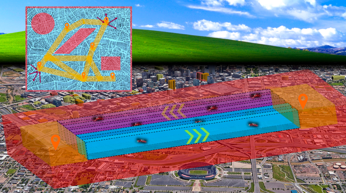 我们的飞行汽车运输系统安全地集成到城市和郊区的天空需要与其他现有飞机,低空飞行器以及我们的V200飞行汽车的交通管理适当共享空域。Varon Vehicles运输系统将在已建立的空域网络内运行包含虚拟通道的卷。这些将连接将考虑城市的移动需求和可用的运输多模式替代方案的顶点,用于第一和最后一英里覆盖。该网络的设计考虑了机场和敏感基础设施等禁飞区,已建立的低空飞机航线,城市地形,风况,障碍物,机动性需求预测和我们的飞行汽车的续航能力。这些空域容量以及其中的虚拟通道将遵循我们称之为Urban Geodesics的方式这是考虑这些因素时从一个顶点到另一个顶点的最短路径。每辆V200驾驶员都会在车上显示一条与所覆盖路线相对应的虚拟车道,这将限制所有V200的位置和高度。虚拟车道向驾驶员指示行程期间的去向,从原点的自动起飞到目的地直升机的自动着陆,以安全和受控的方式。