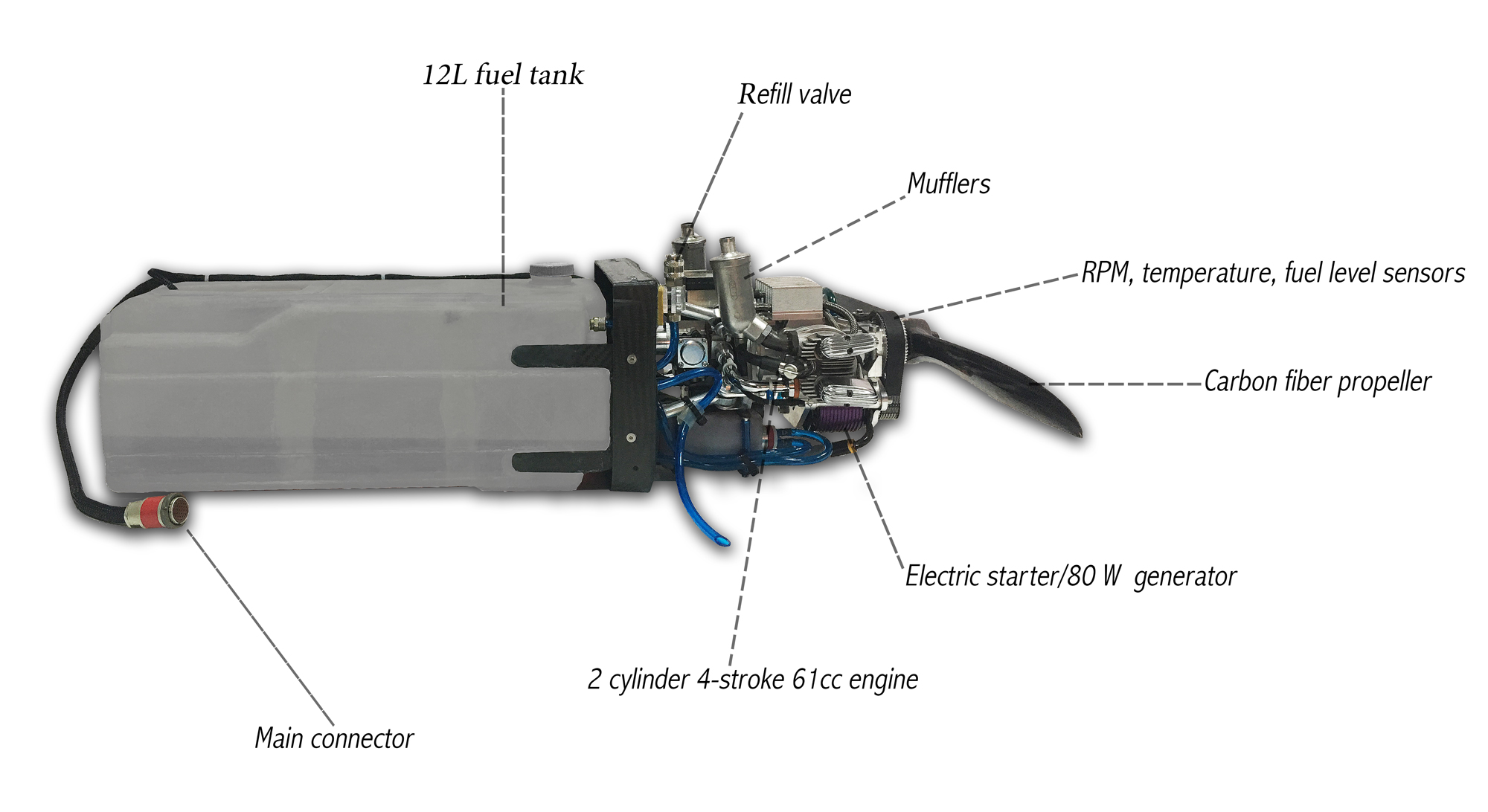 该系统由安静可靠的61cc 2缸4冲程发动机提供动力,配备150W发电机系统,可在飞行过程中为车载所有设备供电。此外,远程启动系统可以在任何情况下自动启动发动机。电动燃油喷射升级可提供最佳性能,并增加15%的续航能力。发动机单元可以轻松更换,因此您无需中断无人机操作即可进行发动机维护或大修。RPM,温度和燃油液位传感器是标准配备。