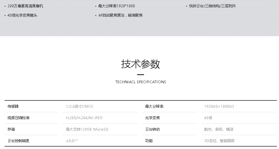 200万像素云台相机具有40倍光学变倍,可在高空查看细节,支持航向锁定与航向跟随模式。