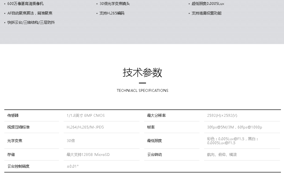 600万像素云台相机具有30倍光学变倍,可在400米外看清车牌,支持航向锁定与航向跟随模式。