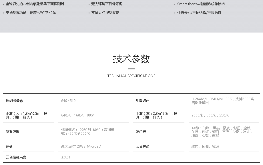 红外热成像具有完全无光环境下的夜视功能,并且支持温度测量及火点报警,支持航向锁定与航向跟随模式。