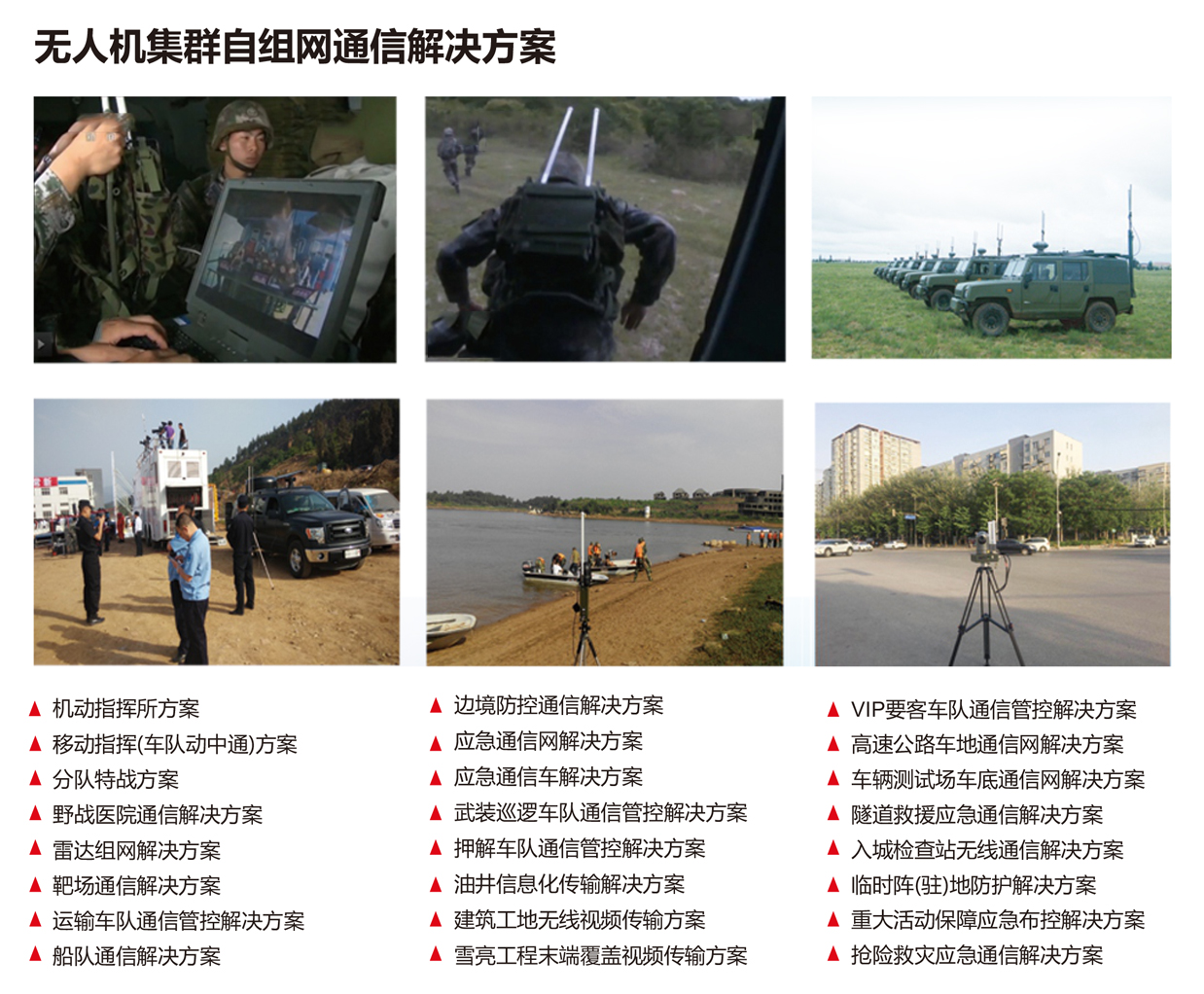 自组网设备可支持行进间车辆动态组网,可适应城市、山区等复杂地形条件下车队的动中通,可支持车队行进态势、电话会议、视频会议、共享电子白板等多媒体指挥调度功能。