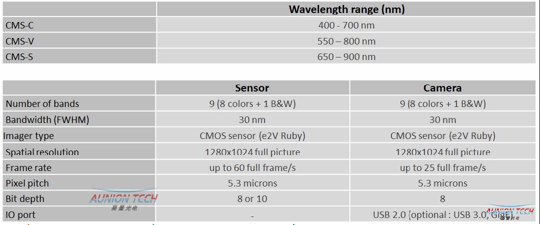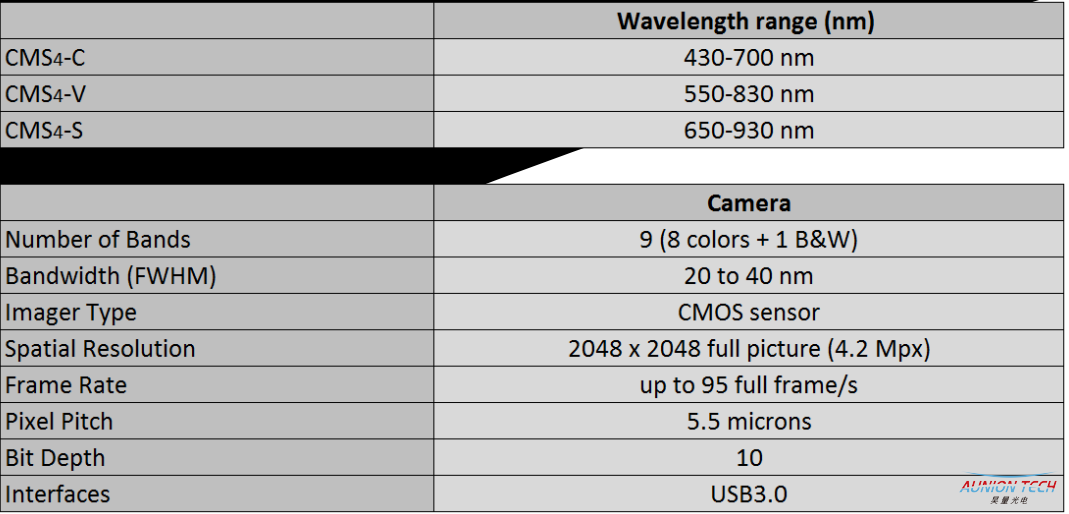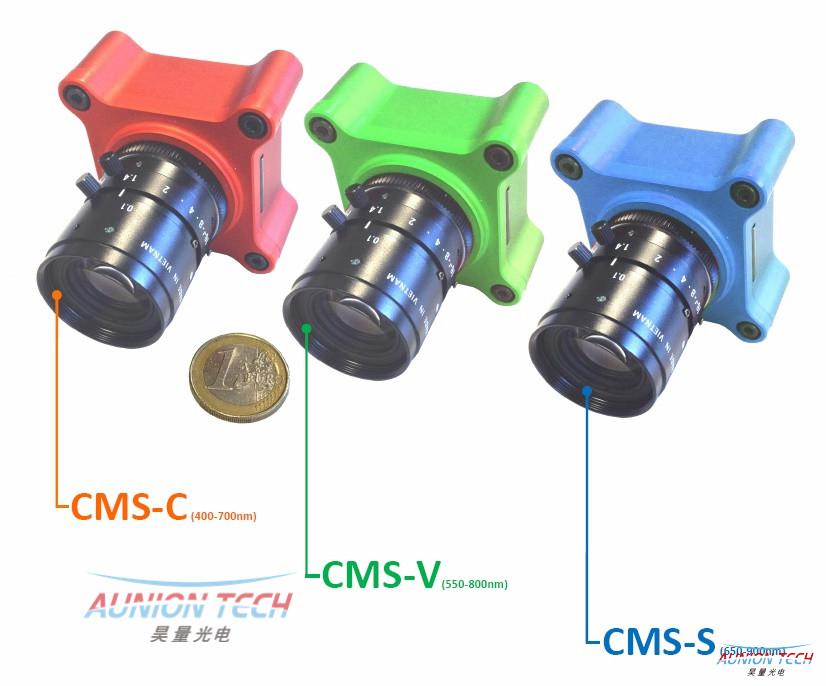 CMS系列微型多光谱相机分为C,V,S三个系列。波段分别覆盖400~700nm,550~800nm,650~900nm。每种型号都由八个覆盖不同波长段的通道及一个全谱段通道组成。