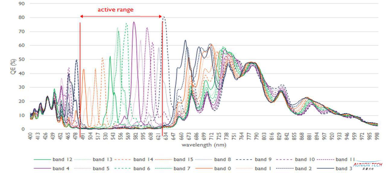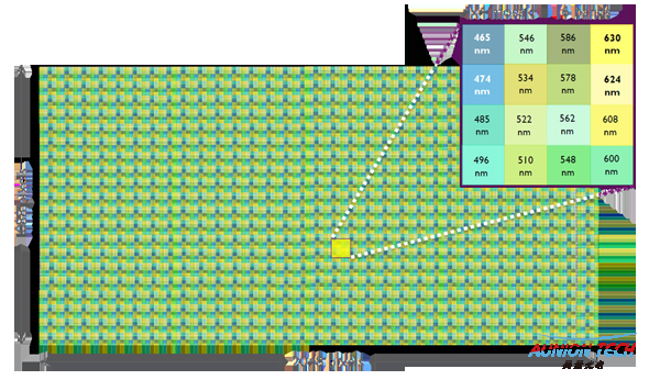 目前IMEC提供三种标准的光谱探测器:100波带的线扫描探测器,25波带以5x5为一个单元的马赛克式镀膜探测器,16波带以4x4为一个单元的马赛克式镀膜探测器,这种方式的光谱带宽一般等于或大于10nm.