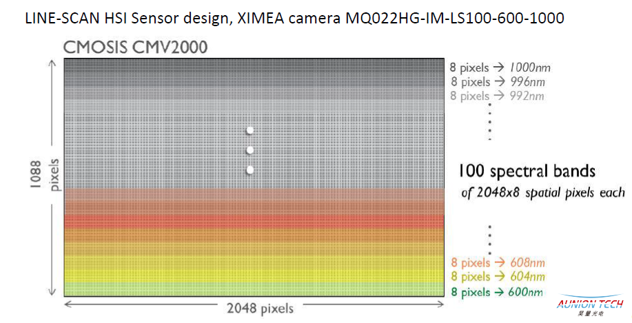 目前IMEC提供三种标准的光谱探测器:100波带的线扫描探测器,25波带以5x5为一个单元的马赛克式镀膜探测器,16波带以4x4为一个单元的点是可以同时获得光谱分辨率和空间分辨率,可以进行快速、高性能的获得光谱信息和空间信息,集成度高,成本低,多用于无人机等大范围扫描的光谱应用领域。马赛克式镀膜探测器,这种方式的光谱带宽一般等于或大于10nm.