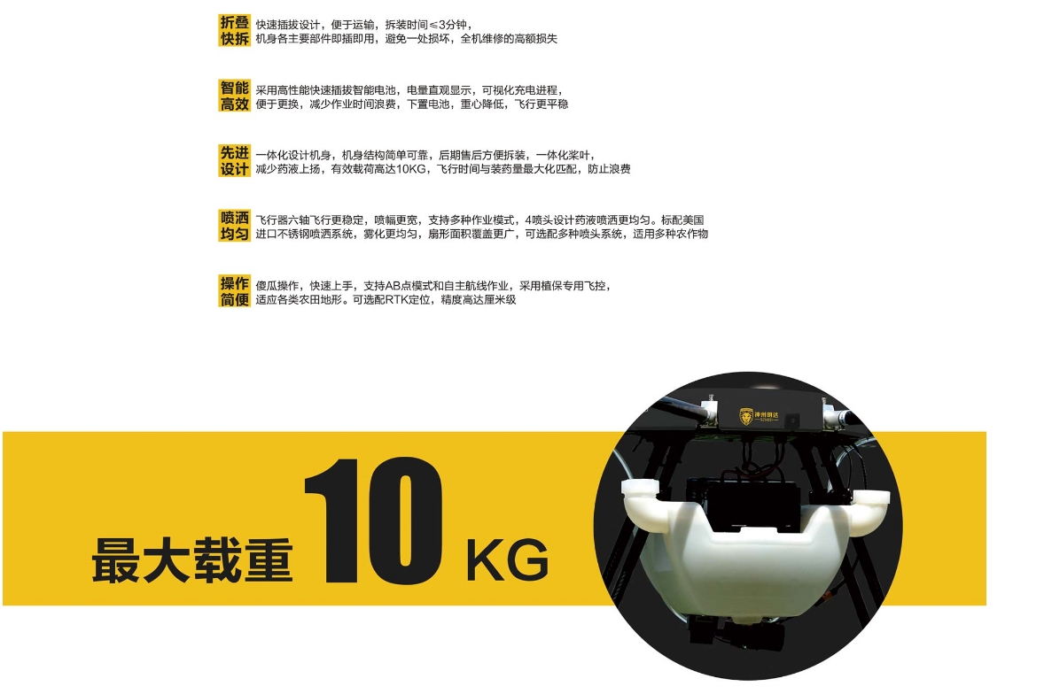 BQX-6A10 六旋翼植保无人机 折叠快拆,高效使用——快速插拔设计,便于运输,拆装时间≤3分钟,机身各主要部件即插即用,避免一处损坏,全机维修的高额损失 智能动力,高效飞行——采用高性能快速插拔电池,电量直观显示,可视化充电进程,便于更换,减少作业时间浪费,下置电池,重心降低,飞行更平稳 先进设计,高效运营——桨叶特殊设计,控制成本,减少药液上扬,有效载荷高达10KG,飞行时间与装药量最大化匹配,防止浪费 作业精确,高效喷洒——飞行器六轴飞行更稳定,喷幅更宽,3喷头设计药液喷洒更均匀。标配美国进口不锈钢喷洒系统,雾化更均匀,扇形面积覆盖更广,可选配多种喷头系统,适用多种农作物 操作简便,高效作业——傻瓜操作,快速上手,支持AB点模式,采用植保专用飞控,适应各类农田地形。可选配RTK定位,精度高达厘米级 获取报价 BQX-6A10 六旋翼植保无人机BQX-6A10 六旋翼植保无人机概述