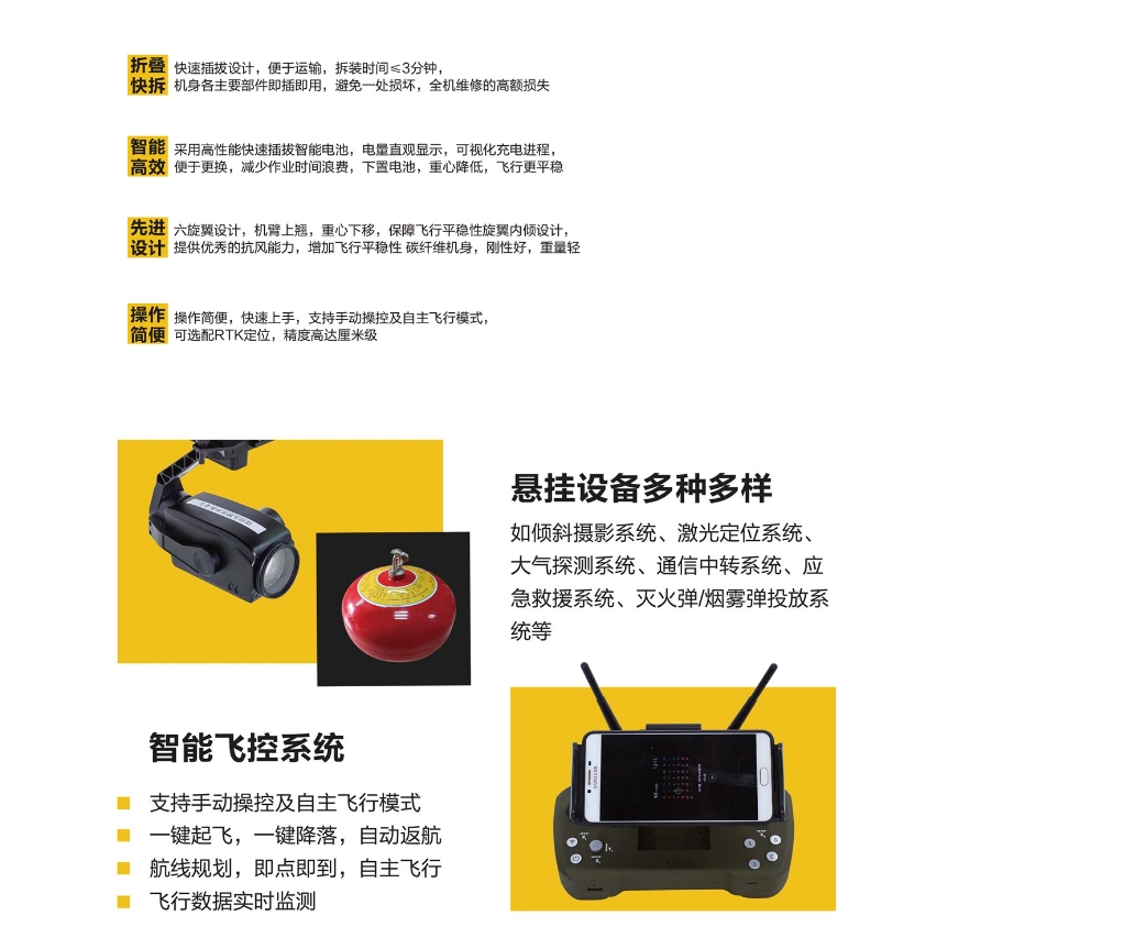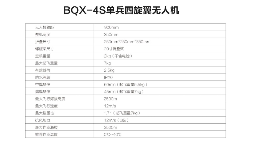 BQX-4S单兵四旋翼无人机 折叠快拆,高效使用——快速插拔设计,便于运输,拆装时间≤3分钟,机身各主要部件即插即用,避免一处损坏,全机维修的高额损失 智能动力,高效飞行——采用高性能快速插拔电池,电量直观显示,可视化充电进程,便于更换,减少作业时间浪费,下置电池,重心降低,飞行更平稳 先进设计,高效运营——整机结构快拆设计,有效载荷高达2.5KG,飞行时间与挂载设备最优化搭配 操作简便,高效作业——傻瓜操作,快速上手,支持自主模式,采用行业专用飞控,适应各类作业环境,可选配RTK定位,精度高达厘米级。