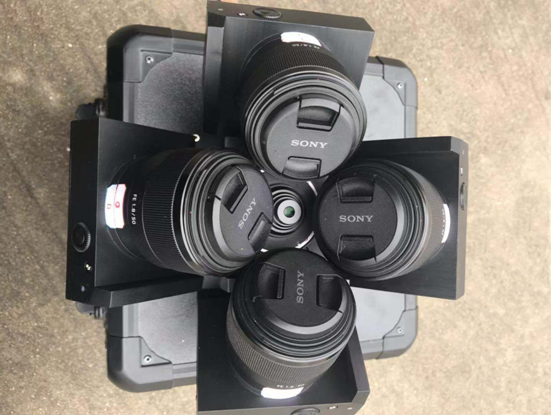 本倾斜摄影系统由五台索尼A7R相机组成,五台相机总像素达到1.8亿像素,可完成3-5CM的精细模型。镜头采用正射35CM镜头;倾斜50CM镜头。整体相机重量:1.7kg。单个架次飞行可完成2-3平方公里5CM倾斜数据采集。
