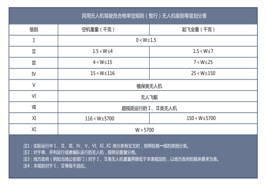 根据中国民用航空局飞行标准司2016年7月下发的《民用无人机驾驶员管理规定(AC-61-FS-2016-20R1)》中,民用无人机驾驶员合格证仍旧分为驾驶员、机长、教员3类。这三类合格证有可以依据类别等级(如:固定翼、多旋翼)及级别等级(级别等级按无人机重量划分)分为多种合格证。