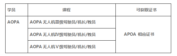 注:AOPA无人机Ⅳ级驾驶员/机长/教员与AOPA无人机Ⅲ级驾驶员/机长/教员的区别是飞机的载重量不同,训练科目完全相同