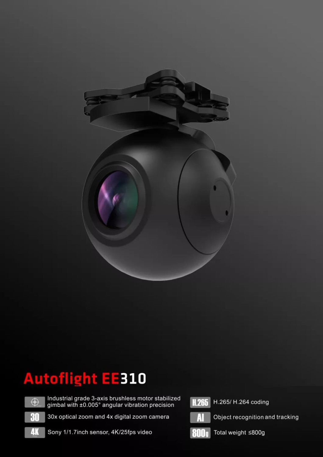 数据安全性和可靠性更为重要。所有数据均经过加密,并通过24ghz视频链接和915MHz遥测技术备份关键数据,以避免数据丢失。V40带有一个4k摄像机,该摄像机具有30倍光学200m,3轴稳定器,稳定度达+/- 0.005高保真度,可以稳定地进行摄影和录像。25fps 640 480分辨率红外摄像头,适用于各种工业应用。板载人工智能模块,使用深度学习算法进行目标识别和跟踪。