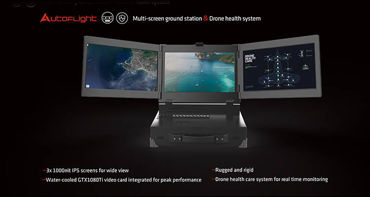 多屏幕地面站三台使用1000nit亮度IPS屏幕,可提供更开放的视野。内置高性能的独立图形视图。内置的无人机健康系统可以对潜在问题进行监视和警告,以精确优化维护周期。