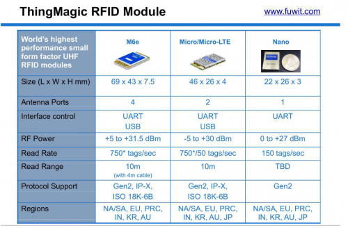 Thingmagic M6e-Micro,采用超小型模组结构设计,和优异的“快速搜索算法”,尤其是快速移动的标签读取。可以嵌入到各种常用的手持和便携式设备,例如打印机和手持电脑。它也可以被用于设计小型的读写器设备,或者当作现有设备的附加配件,实现各种自动化的需求。读取距离取决于天线尺寸以及材料。同时搭配相同的天线,它的读写距离能达普通模块的两倍以上。