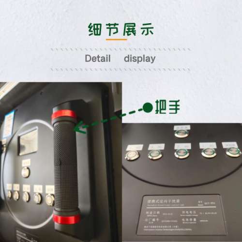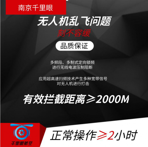 QLY-PD1是千里眼航空自主研发的无人机拦 截设备。以多频段多制式定向锁频进行无线电波压 制阻断,应用超高速扫频技术产生多种宽带信号对 无人机进行打击,具有体积小、操作使用方便、可 靠性高、被动式无辐射、 防水效果强、干扰时不影 响用户自身电磁设备等优势;带单片机,可监控核心 模块工作情况。