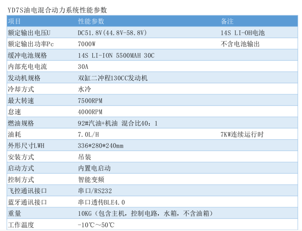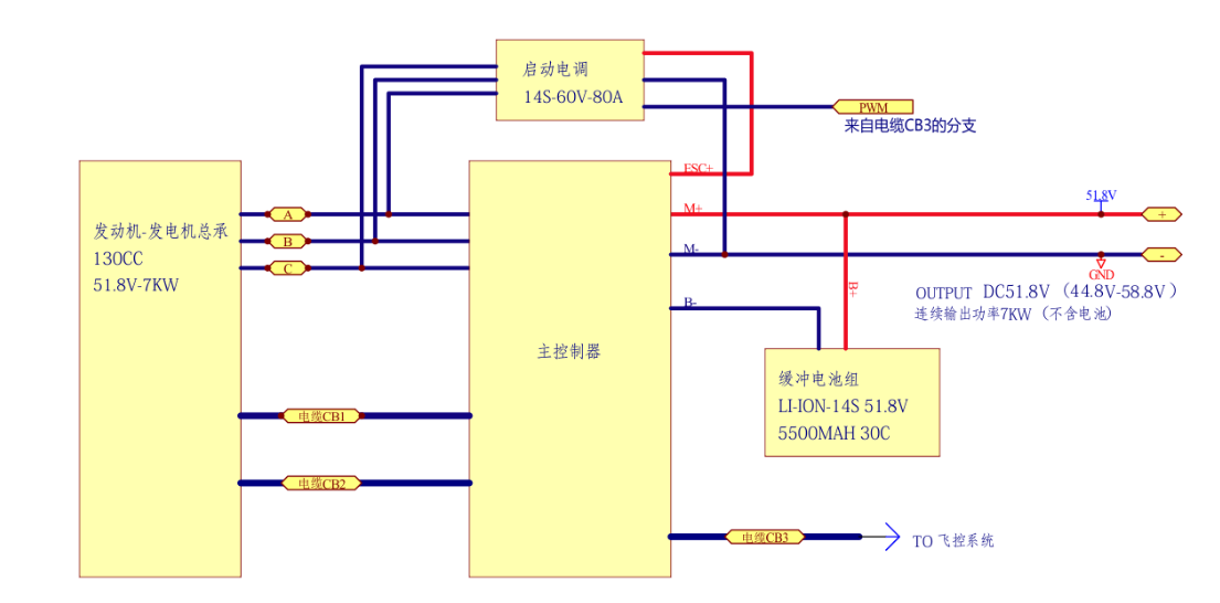 油电混合动力系统由发动机,发电机,控制器和缓冲电池组成。发动机旋转带动发电机旋转发出交流电,经控制器内整流变为直流输出,控制器根据用电量多少控制发动机油门从而控制输出功率。缓冲电池组并联在输出回路上,当用电需求很大时,由发电机和缓冲电池一起供电;当用电需求一般时,由发电机单独供电;当用电需求很小时,由发电机供电并向缓冲电池组充电;这样,油电混合动力系统能够保持稳定的电压输出,并且能够快速响应大幅度的电流波动。这种特性特别适合于多轴大载荷的无人机使用。