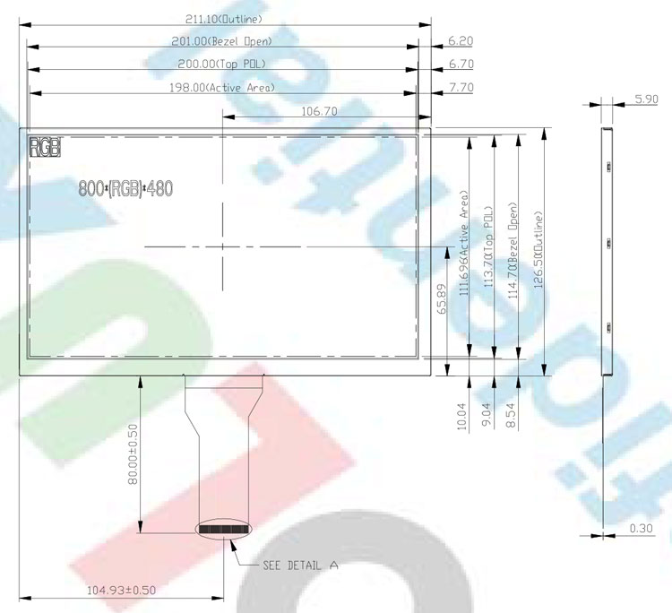 | 驱屏电压 | 3.3/10.4/17.0/-5.0V(DVDD/AVDD/VGH/VGL) | 显示区域 | 198.0*111.696 mm |