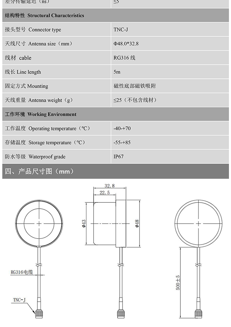 北天磁吸四星单频GPS北斗GPS导航sma挖泥船外置GNSS天线BN-5B43AJ