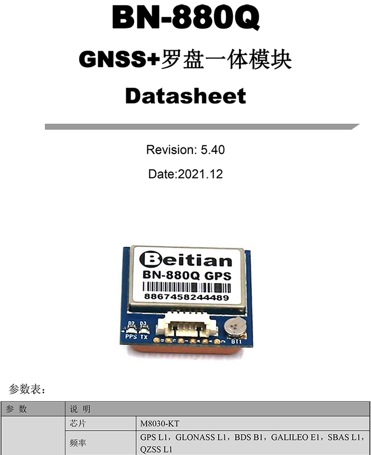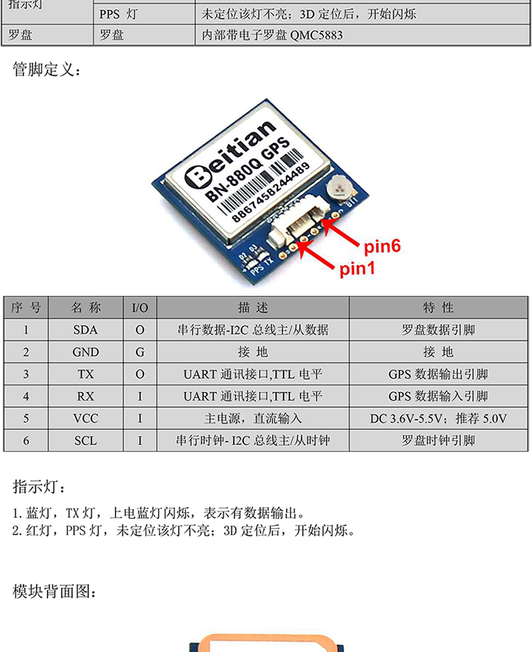 默认出货:GPS+GLONASS双模,5V供电,内置FLASH,TTL电平输出,9600,1HZ输出,NMEA-0183协议输出,带QMC5883L罗盘。