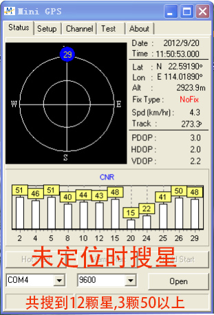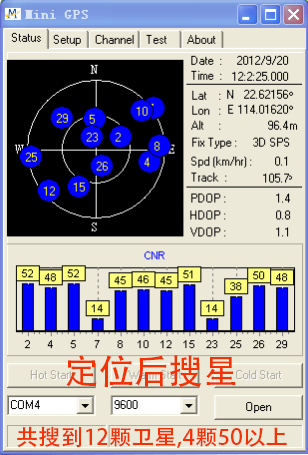上图天线在开阔天空处的实际搜星情况,天线做过50欧姆阻抗设计,经过天线匹配,