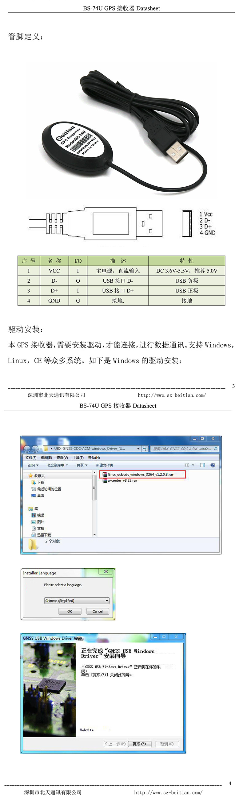 5: BS-74U 单GPS芯片单GPS模式定位,USB接口,USB电平,2米,5V供电,9600波特率,1HZ,NMEA-0183协议输出。