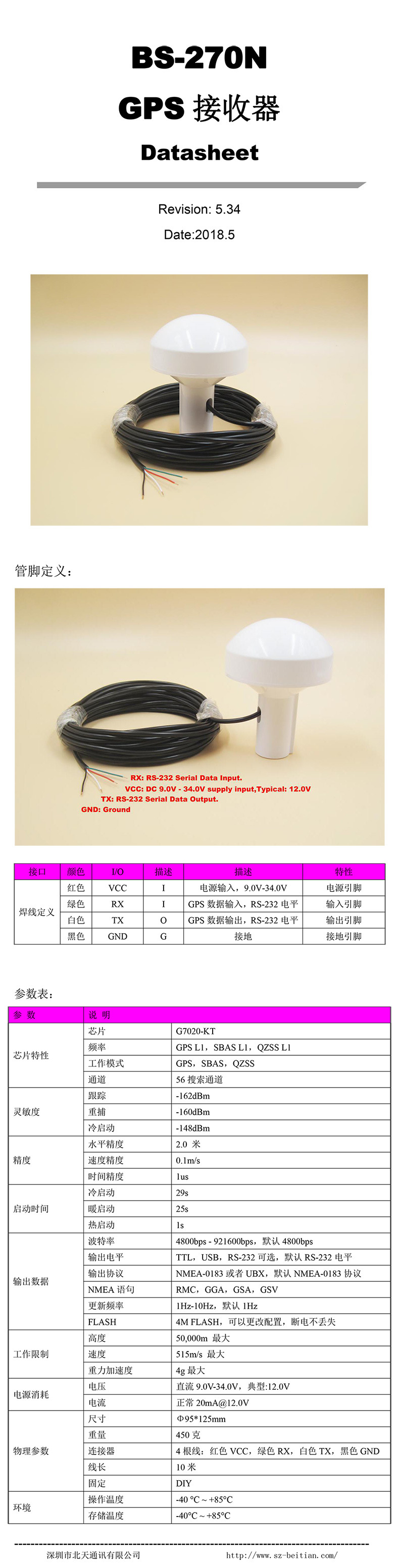 默认出货:米,12V供电,232电平输出,4800,1HZ输出,标NMEA-0183协议(RMC,GGA,GSA,GSV四条语句)输出。