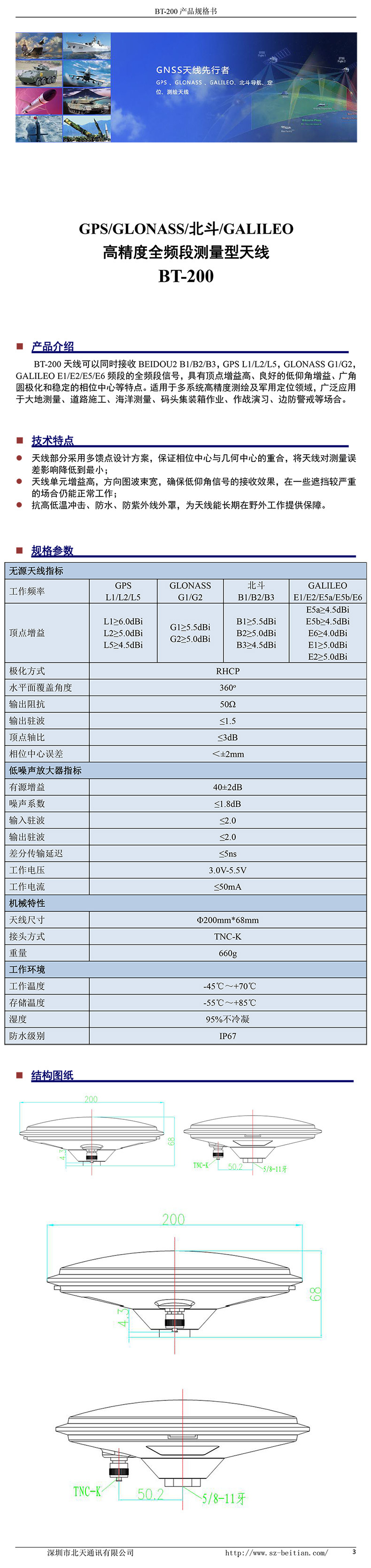BT-200天线可以同时接收BDS B1/B2/B3,GPS L1/L2/L5,GLONASS G1/G2,GALILEO E1/E2/E5/E6频段的全频段信号,具有顶点增益高、良好的低仰角增益、广角圆极化和稳定的相位中心等特点。适用于多系统高精度测绘及军用定位领域,广泛应用于大地测量、道路施工、海洋测量、码头集装箱作业、作战演习、边防警戒等场合。